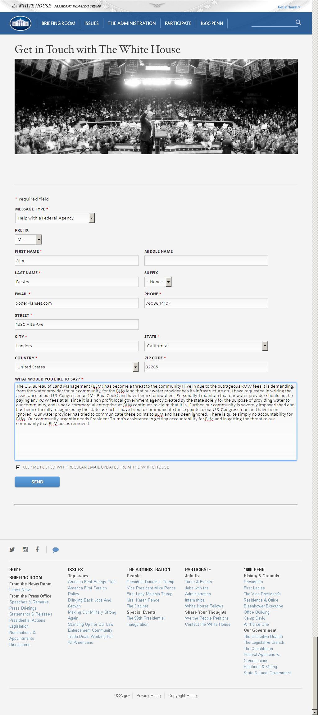 On January 21, 2017, someone from the LandersWaterRescue.com ratepayers group posted on whitehouse.gov a request for assistance with BLM from President Trump. The full text of that web posting is available here. That person never received a reply to that request for assistance.