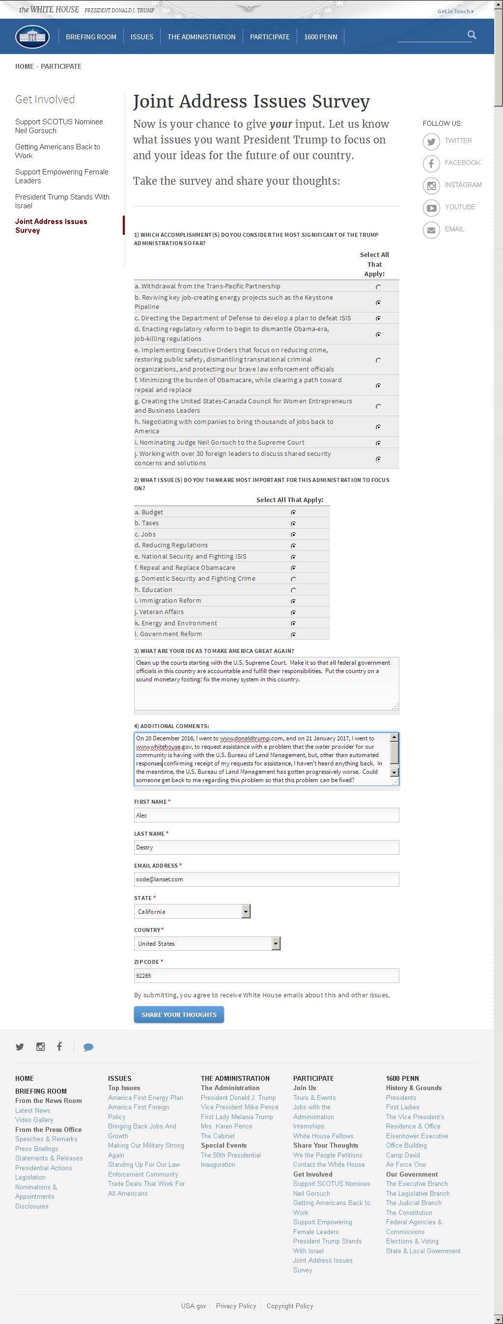 On February 26, 2017, someone from the LandersWaterRescue.com ratepayers group posted on whitehouse.gov a second request for assistance with BLM from President Trump. The full text of that web posting is available here. That person never received a reply to that request for assistance.